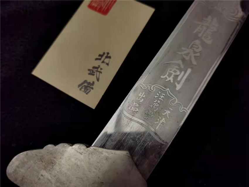 这支汪萬豊造的民国大剑非常少见,整体状态非常好,包括剑柄绳和鞘提梁上的老提携和绳子都是原配的,很多剑这些附属小配件都缺失了,剑装具黄铜镀镍保存完整,基本没有露铜的部位,握把包珍珠鱼皮没有任何破损,剑身镀铬刃口完整没有伤,一面略有浮锈,剑刃带有类似马牙纹的纹理,剑根部有十字铭文龍泉剣天津汪萬豊出品,另外一侧 是兰花图案,这支剣全长106厘米,属于非常少见的长剑,剑柄双手持握,因为剑身比较长所以这种剣的厚度都不会非常厚,剑身钢性好有弹性硬度高,汪萬豊在能查到的资料里为民国时期制作剪刀厨刀等工具的匠人,因有朋友说起制作工具的匠人打造不出太好的兵器,其实不然,在民国时期烽火连三月动乱时期,很多打造兵器的高手都会打造农具得以温饱,就像日本二战结束后,很多刀剑名家为了生活,不得已转行制作了农具,现在日本很多当时的农具上都有当时锻刀名家打造后留下的铭文,所以判断一把剑的好坏要以上手实物为准,并不要推测臆想。