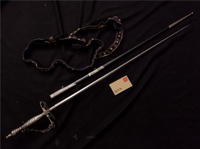 这是一支英国十九世纪早期的佩剑,整体状态完好全钢制,包括握把剑刃和剑鞘的配件都是全钢制作,大家都知道在古代鐡要比铜难加工,这支剑的亮点就是全鐡制,握柄制作用尽了极致工艺,柄上的防滑疙瘩直径最小0.2厘米,都是多面体设计,视觉漂亮防滑实用,包括护手链也用到了很多工艺难以用文字形容,档手并不是正圆是椭圆设计,并且镂空用来减轻重量,刃部三角带凹槽设计,这种设计不止能减轻剑身重量,又能加大伤口的创伤,刀鞘状态也非常不错,并且带有原配的腰带,这种佩剑是英国法国等国家贵族佩戴的一种轻剑,也许大家还记得电影佐罗,这种剑只能直刺没有劈砍功能,属于贵族使用的武器,如同现在奥运会击剑比赛一样,在决斗时候讲究身法手法配合姿势优美,看着剑刃非常纤细,但是杀伤力还是非常厉害,这种年代好制作工艺好的藏品在国内非常少见,是刀剑收藏爱好者的收藏佳品!!!