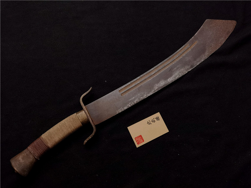 这支砍整体状态良好,原铆,原配柄三件,原配老柄木,刃部厚实原始状态没有后期整理研磨,刀身血槽开制异常规整,握柄和常见砍不同,常见砍多为直柄,这支砍柄带有弧度,这种设计更适合劈砍,铜挡手厚实S型设计 ,这支砍的造型和新军一款砍非常相似, 因为资料缺失只能按照新军砍分类,确实是不常见的藏品,极有可能是当时用来行刑用的一种砍!!!