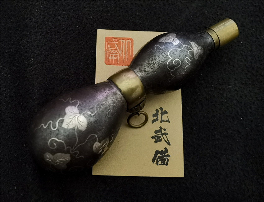 日本江户时期鐡錽银葫芦,整体状态非常棒,全鐡制作的葫芦身上在做錽银工艺,錽银的葫芦叶子和藤蔓随型分布在葫芦表面,葫芦腰部束铜箍,外出的时候可以随身携带,葫芦口镶铜配铜封帽,小的金工葫芦还是很常见的,这种大的金工葫芦还是非常少见,是日本古时候用来装火药的用具,喜欢日本金工的朋友不要错过。