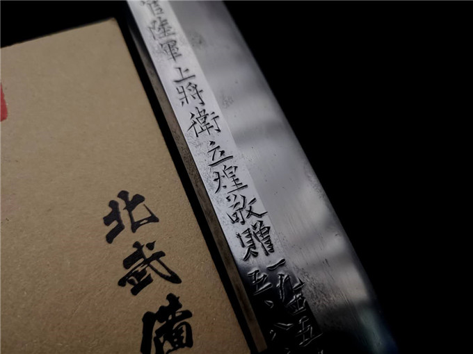 锁定衛立煌(1897年2月16日~1960年1月17日),字俊如,又字辉珊,安徽省合肥县人,中华民国高级将领,国军陆军二级上将军衔,是蒋介石的"五虎上将"中的"虎将"。取得了中原大战中击败石友三解除南京之围、鄂豫皖"围剿"、镇压"闽变"分路暨主功、击败冈村宁次收复郑州、缅北滇西反攻战役(含强渡怒江战役)等一系列战役的胜利。忻口会战亦破坏了日军的作战计划。建国后曾任国防委员会副主席,第二、三届全国政协常委,第二届人大代表,民革第三、四届中央委员会常委等职。日军华北最高司令香月清司称其为"支那虎将 "。史迪威在回忆录中称其为国民党军队中最能干的将领,美国出版的《中国人名大辞典》称其为"常胜将军"。 1960年1月17日,因病在北京逝世,享年64岁,安葬于北京八宝山革命公墓。 数据: 全长 ~含鞘全长98厘米 刃长~刃长69厘米 元幅~元幅3厘米 先幅~先幅2.2厘米 元重~元重0.8厘米 先重~0.55厘米 自人类发明文字以来,文字逐步代替了图案成为重要的沟通工具和记录手段。古时代的人们会在坚固的物体或重要的器物上錾刻文字来记录当时发生的重大事迹以便保存或示人,这便是铭文的形成。在重器上面的铭文要比器物本身的价值还要珍重,因此后人把重大事件的记录叫做铭记。 此刀为远征军国军缴获战利品,又被国军五虎上将之一的衛立煌送给了友军高级将领,承载的历史意义非凡,向远征军将士致敬!!!!! | ||||||||||
