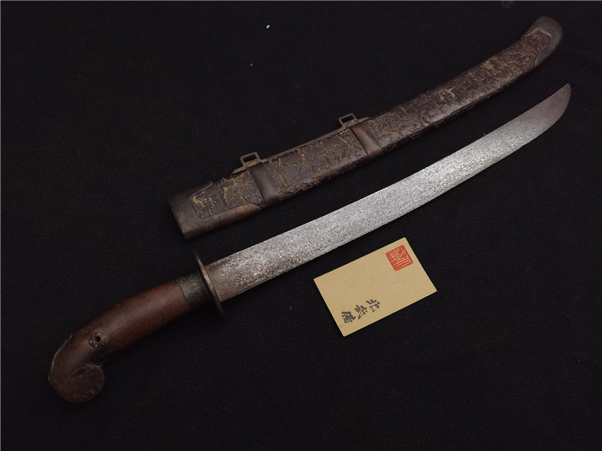 数据: 含鞘全长59.1厘米,刃长41.7厘米,刃厚0.9厘米,刃宽3.1厘米。 这支腰刀年份非常好,原装原配,没有任何整理,木柄非常特殊和常见腰刀柄有所不同,这支柄整个由黄杨木制作,侧面看和如意头侧面非常像,所以称作如意柄,因为年代久远黄杨木柄经过几百年的盘玩包浆紫红非常漂亮,柄上手花铆片一侧缺失,纯木柄能完整保存下来的非常少弥足珍贵,刀身平造厚实典型的实战小腰刀,刃部隐约可以看到折叠锻打的流水纹,持握手感非常棒,木鞘披麻加灰上大漆,工艺非常到位,铜件和平时常见清代腰刀有所不同,虽然素铜配件但是整体非常协调,也有一种说不出来的味道,感觉非常棒。 这种实战小腰刀很有可能是配合长杆兵器使用的制式武备,存世量非常稀少,收藏价值极高!!!