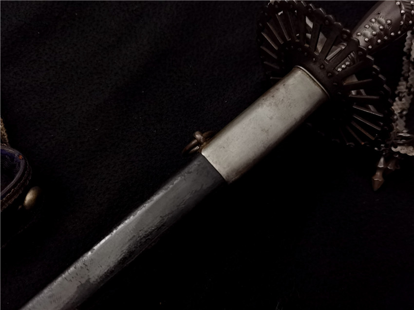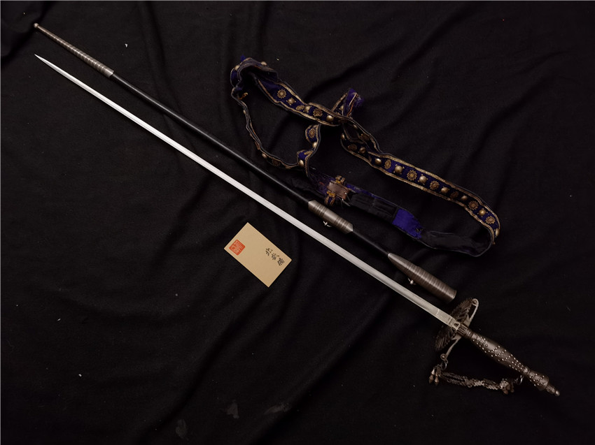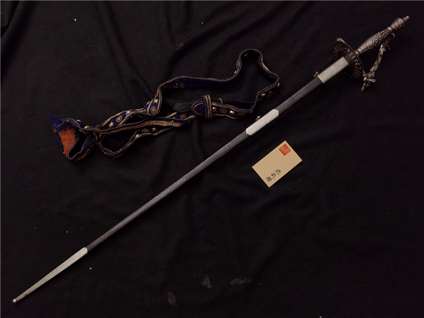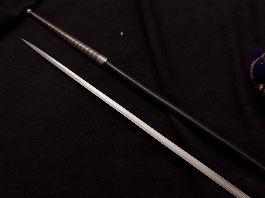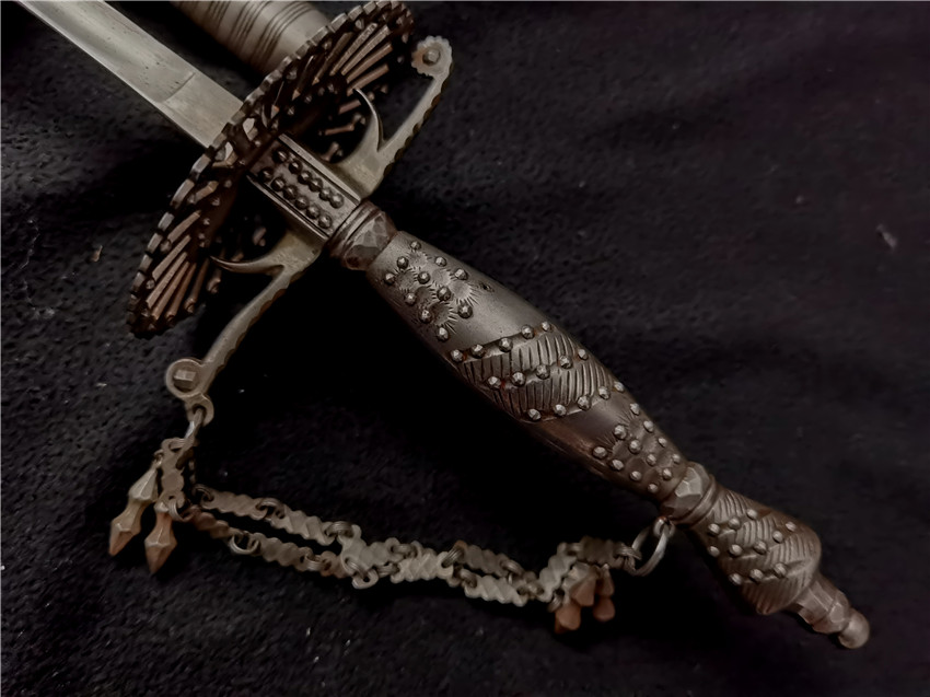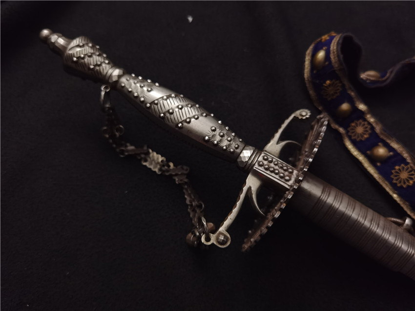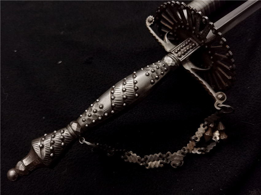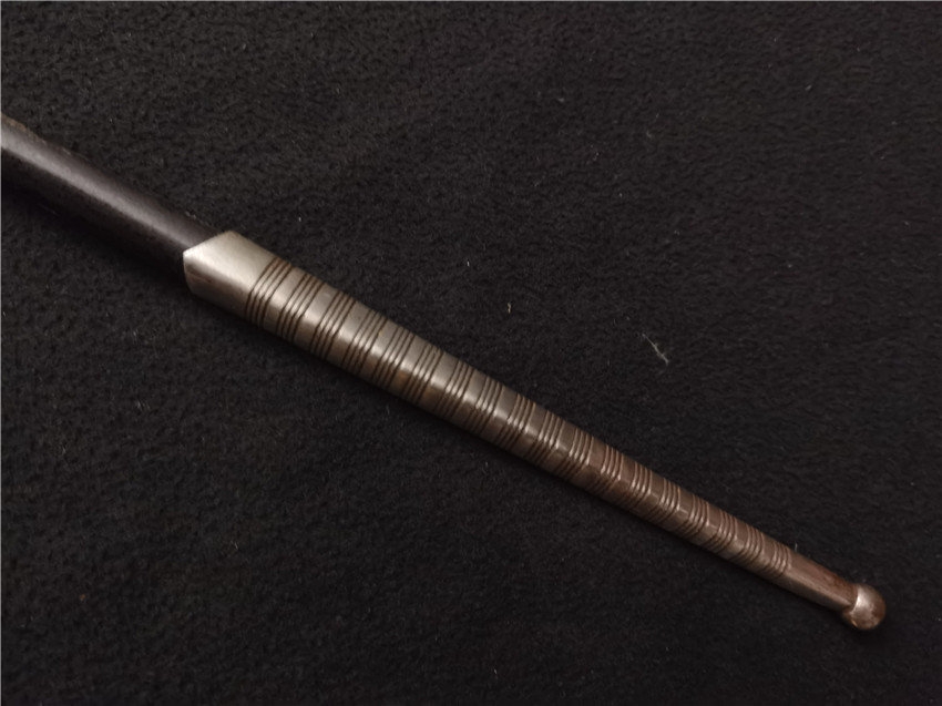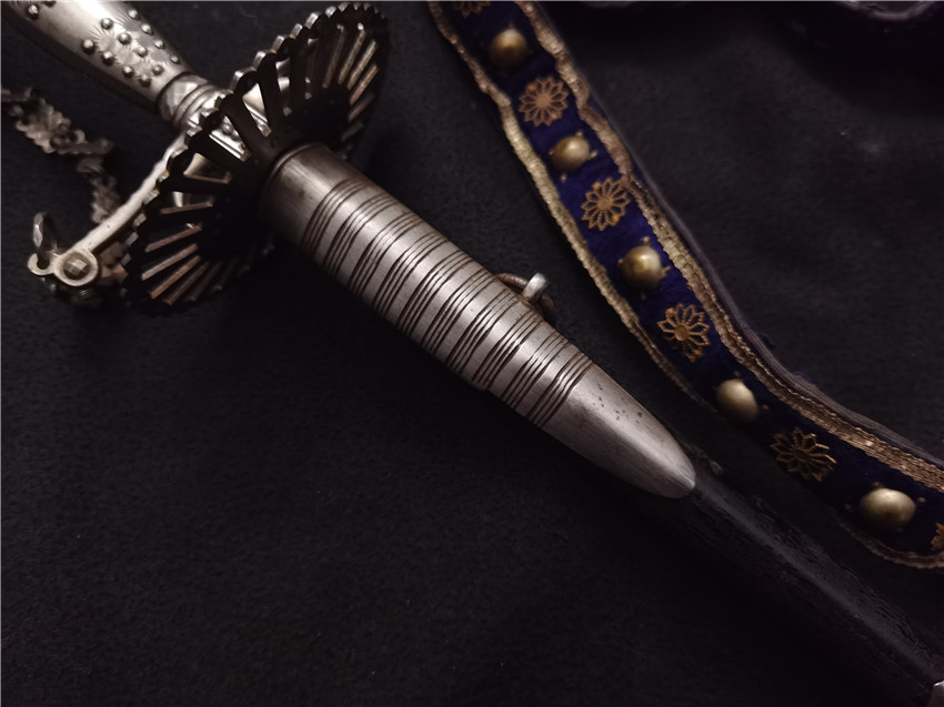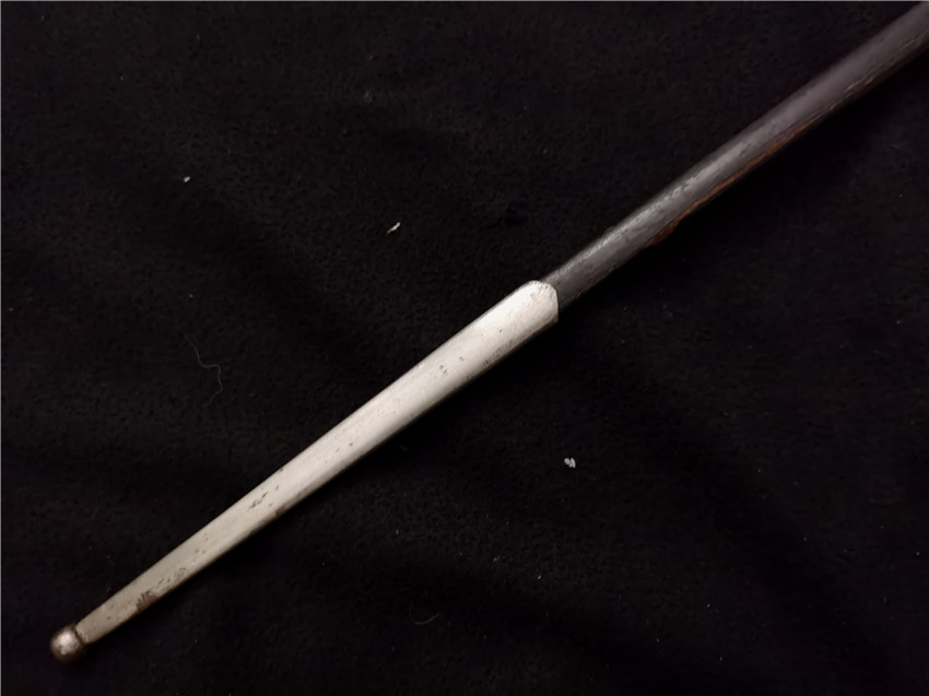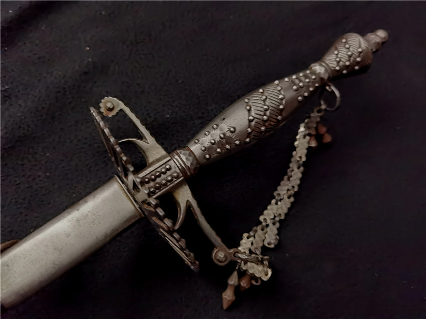 数据: 含鞘全长95厘米,柄长17.5厘米,刀档直径9.2X7.8厘米,刃长78.5厘米,刃直径1.4X0.85厘米。 这是一支英国十九世纪早期的佩剑,整体状态完好全钢制,包括握把剑刃和剑鞘的配件都是全钢制作,大家都知道在古代鐡要比铜难加工,这支剑的亮点就是全鐡制,握柄制作用尽了极致工艺,柄上的防滑疙瘩直径最小0.2厘米,都是多面体设计,视觉漂亮防滑实用,包括护手链也用到了很多工艺难以用文字形容,档手并不是正圆是椭圆设计,并且镂空用来减轻重量,刃部三角带凹槽设计,这种设计不止能减轻剑身重量,又能加大伤口的创伤,刀鞘状态也非常不错,并且带有原配的腰带,这种佩剑是英国法国等国家贵族佩戴的一种轻剑,也许大家还记得电影佐罗,这种剑只能直刺没有劈砍功能,属于贵族使用的武器,如同现在奥运会击剑比赛一样,在决斗时候讲究身法手法配合姿势优美,看着剑刃非常纤细,但是杀伤力还是非常厉害,这种年代好制作工艺好的藏品在国内非常少见,是刀剑收藏爱好者的收藏佳品!!! (十九世纪早期相当于中国清代嘉庆时期) | ||||||||||