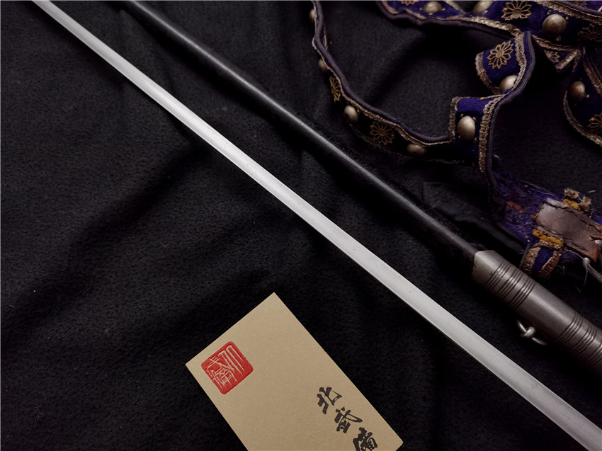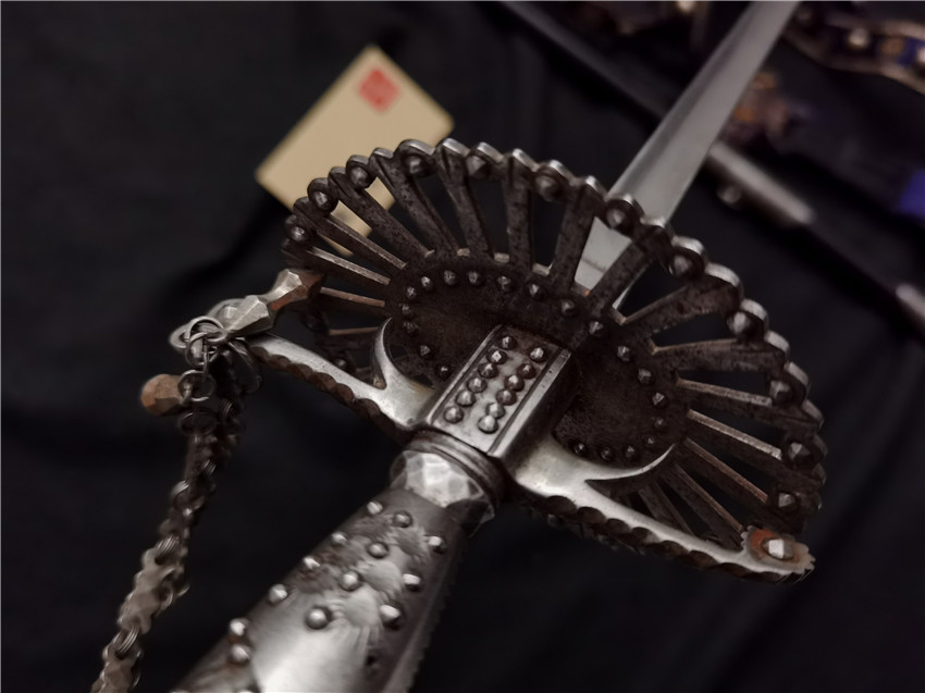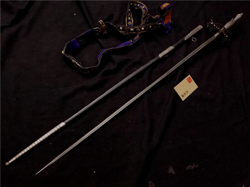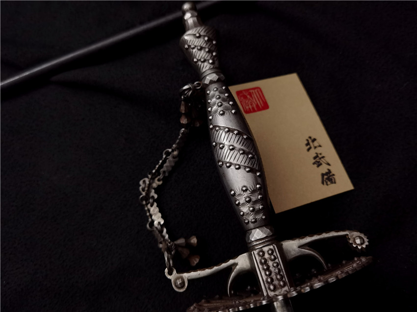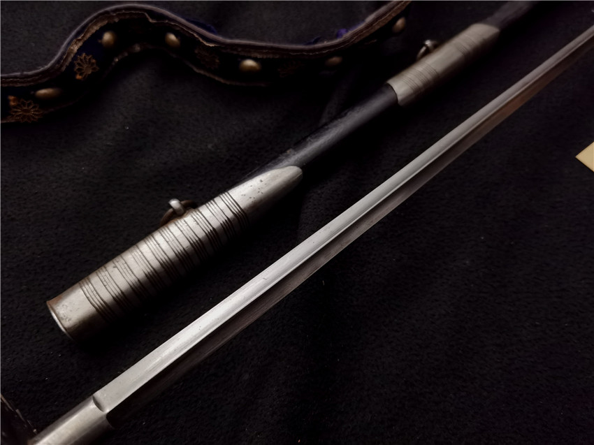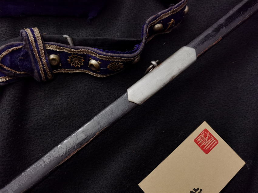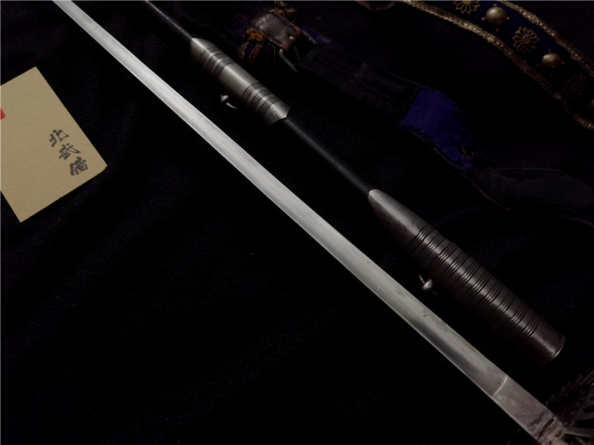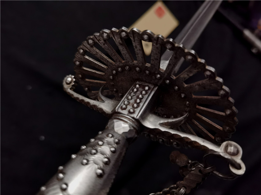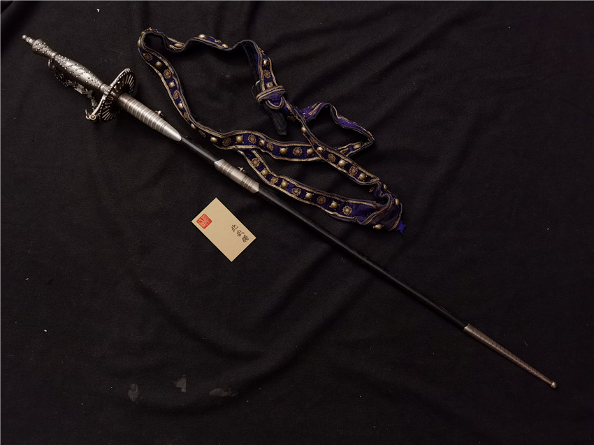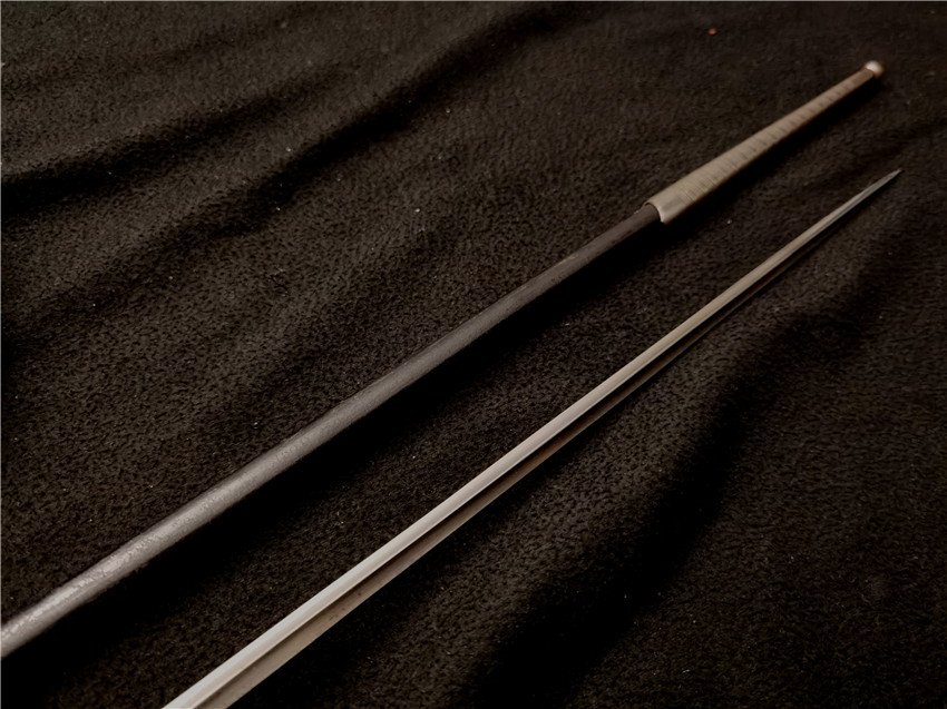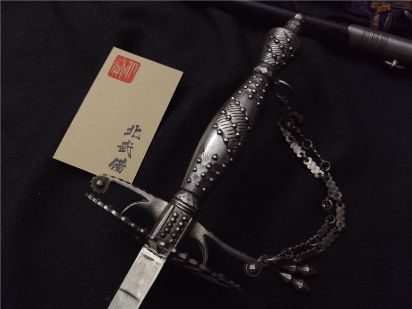 数据: 含鞘全长95厘米,柄长17.5厘米,刀档直径9.2X7.8厘米,刃长78.5厘米,刃直径1.4X0.85厘米。 这是一支英国十九世纪早期的佩剑,整体状态完好全钢制,包括握把剑刃和剑鞘的配件都是全钢制作,大家都知道在古代鐡要比铜难加工,这支剑的亮点就是全鐡制,握柄制作用尽了极致工艺,柄上的防滑疙瘩直径最小0.2厘米,都是多面体设计,视觉漂亮防滑实用,包括护手链也用到了很多工艺难以用文字形容,档手并不是正圆是椭圆设计,并且镂空用来减轻重量,刃部三角带凹槽设计,这种设计不止能减轻剑身重量,又能加大伤口的创伤,刀鞘状态也非常不错,并且带有原配的腰带,这种佩剑是英国法国等国家贵族佩戴的一种轻剑,也许大家还记得电影佐罗,这种剑只能直刺没有劈砍功能,属于贵族使用的武器,如同现在奥运会击剑比赛一样,在决斗时候讲究身法手法配合姿势优美,看着剑刃非常纤细,但是杀伤力还是非常厉害,这种年代好制作工艺好的藏品在国内非常少见,是刀剑收藏爱好者的收藏佳品!!! (十九世纪早期相当于中国清代嘉庆时期) | ||||||||||