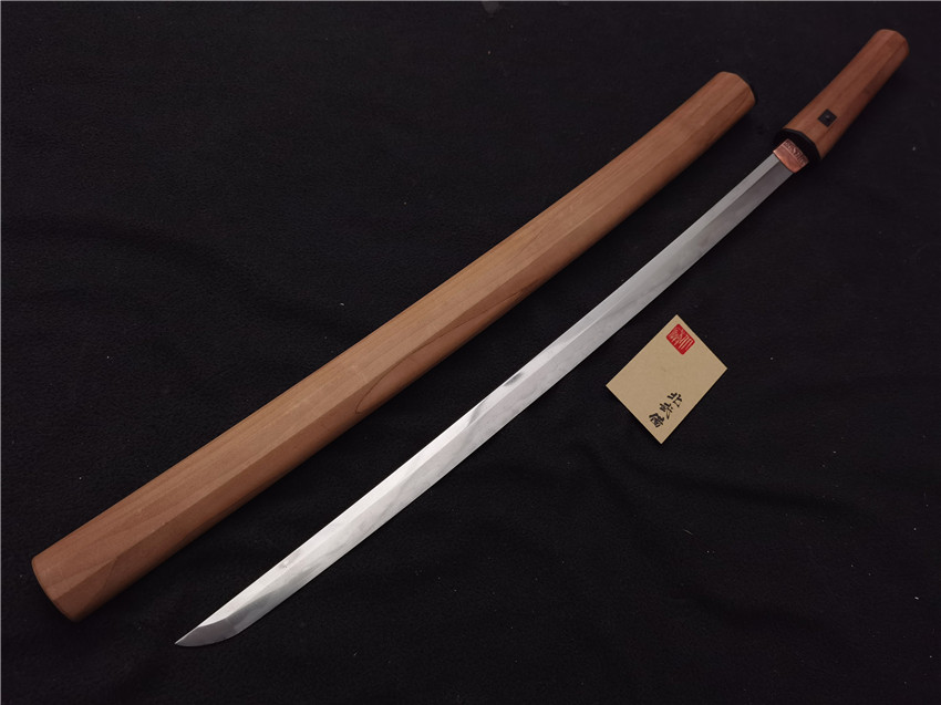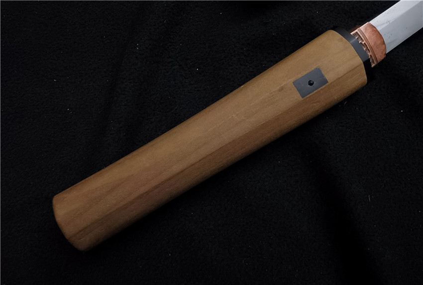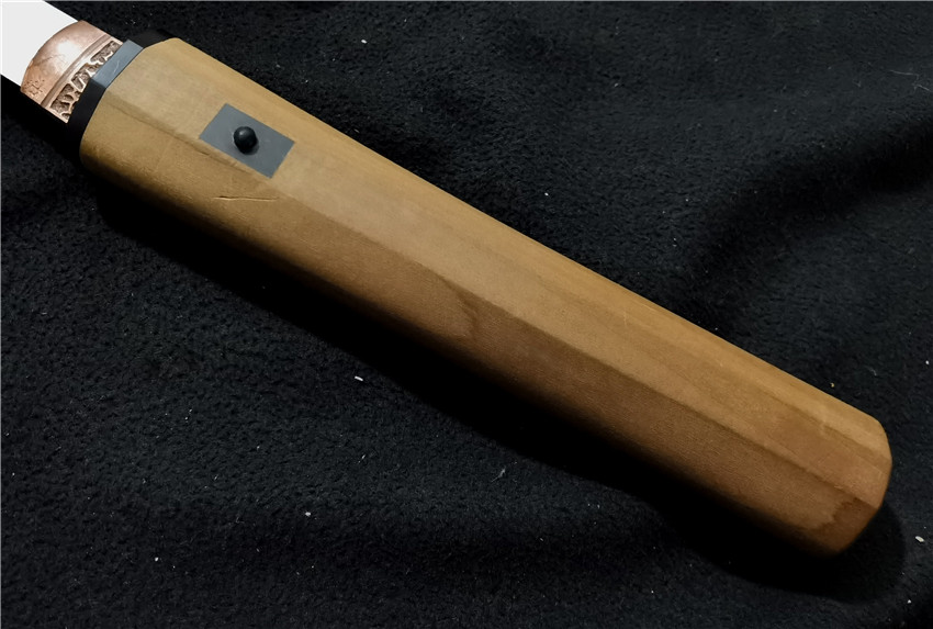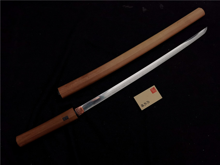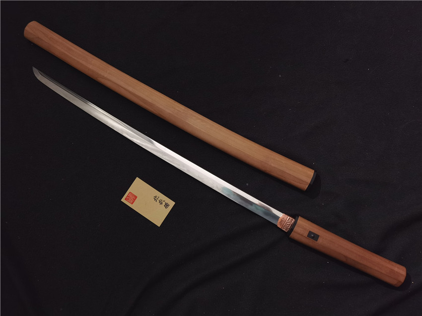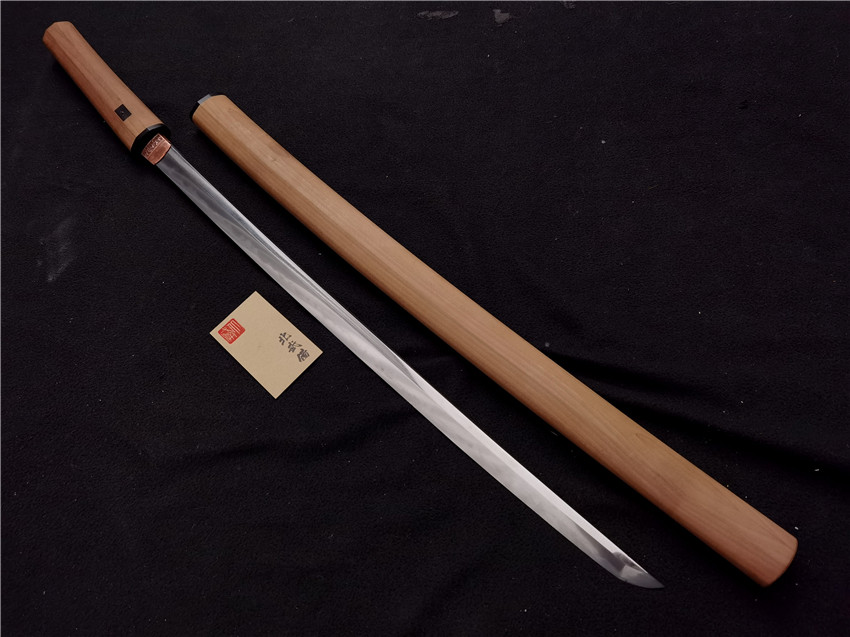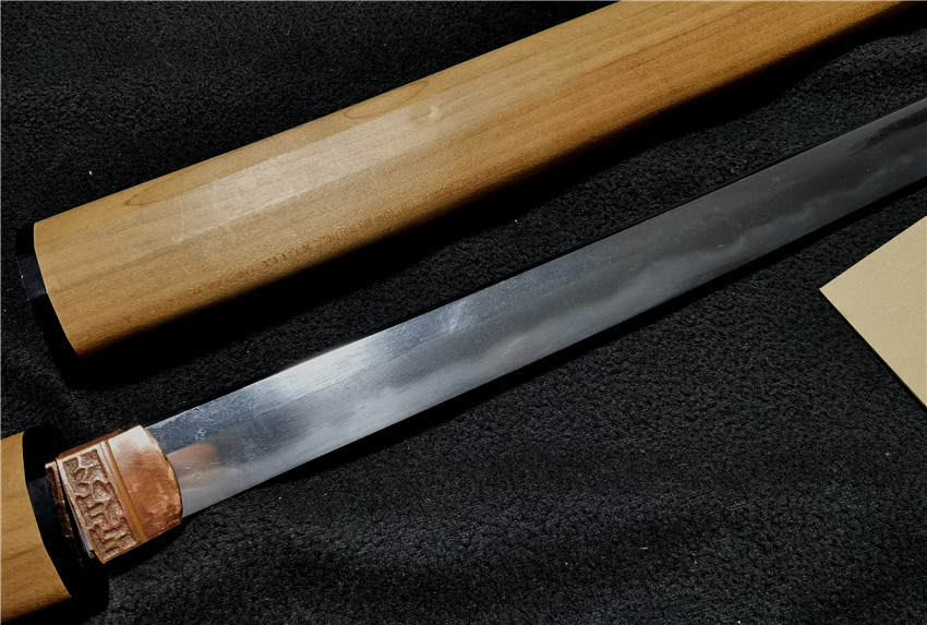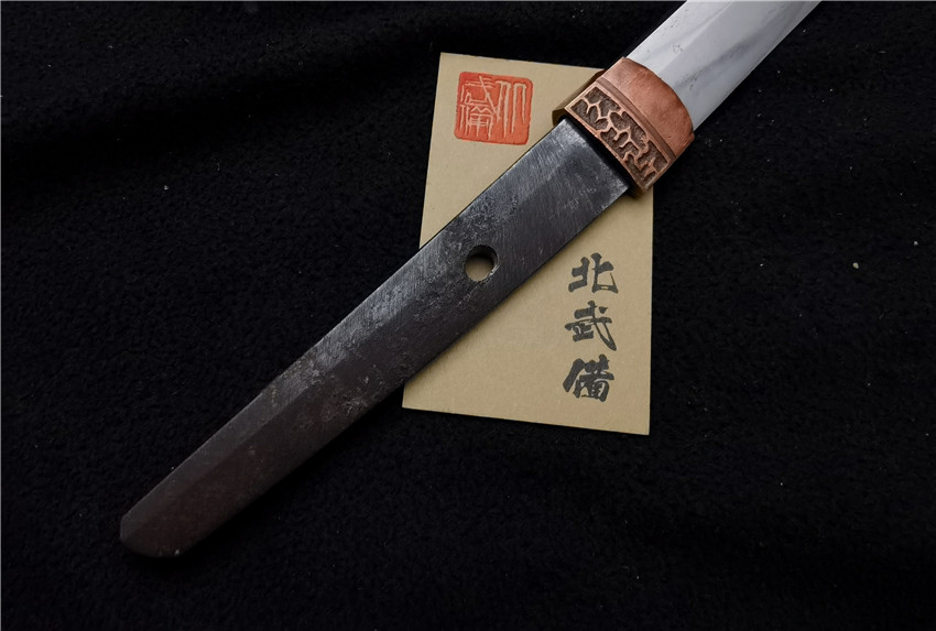 数据: 全长~含鞘全长85.3厘米 刃长~刃长63厘米 原重~原重0.6厘米 先重~先重0.4厘米 原幅~原幅2.55厘米 先幅~先幅1.9厘米 於洛阳伊藤权左卫门尉广信是第二代广信,第一代是宽永时期的人,第一代和第二代都住在山城国制作刀。二代广信将改名为洛阳住伊藤权左卫门尉广信、洛阳住于纪州藤原广、伊藤大和守源广信等,第三代继承了河内守,四代被称为弥左卫门尉,在享保时期大显身手,现存的作品很少,资料性很高。 河内守源廣信的资料很少,这支他的作品整体状态非常好,朴木鞘状态完整,生颈在铭,刀条原始状态没有整理过,刃纹清晰漂亮,地肌锻造紧密可以清晰的看到纹理走向,整体来说除了进出鞘的磨痕还算是一支比较不错的好刀,适合初级藏家入门的藏品。(可以出具中国古兵器研究协会鉴定证书) (约300年左右) | ||||||||||