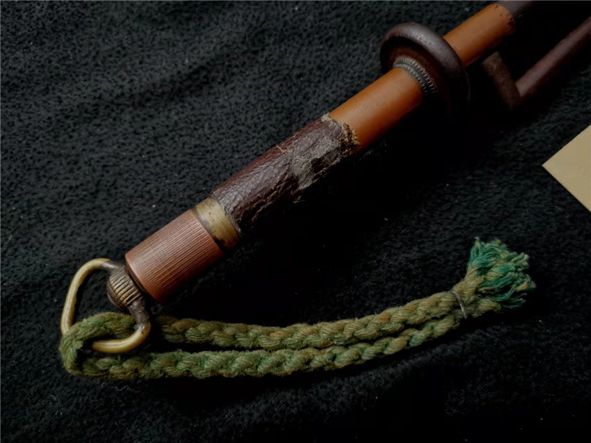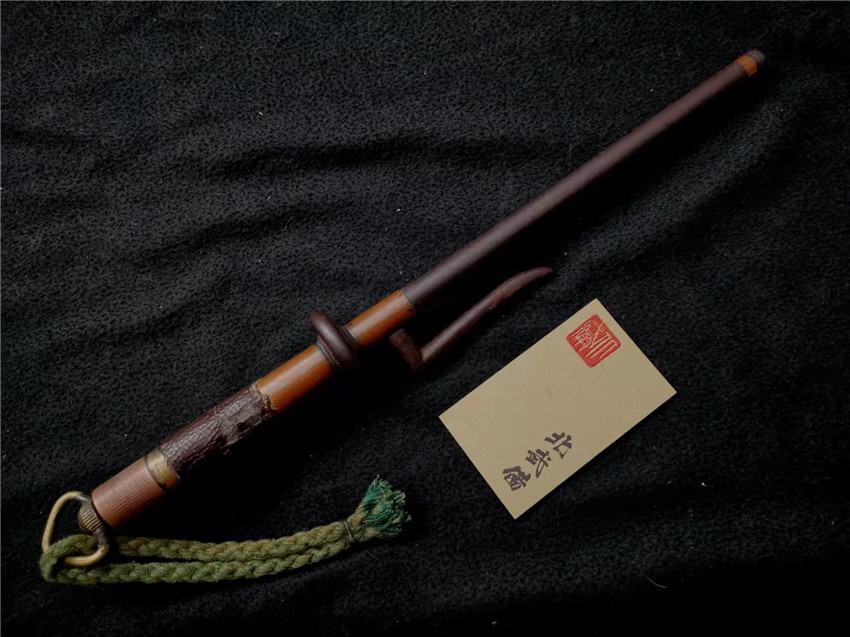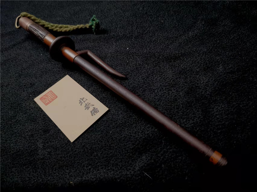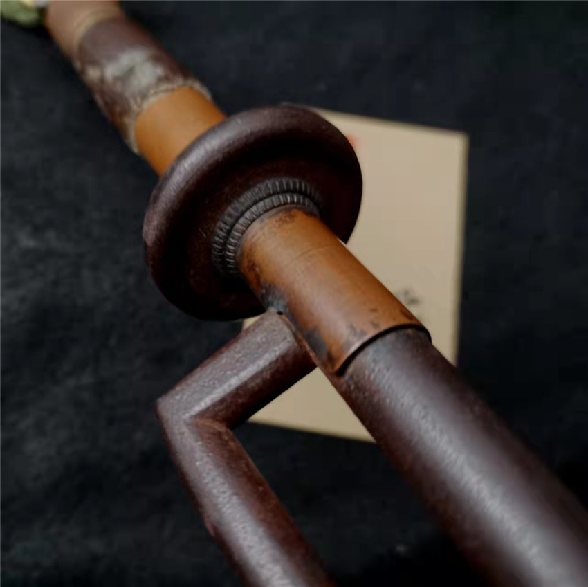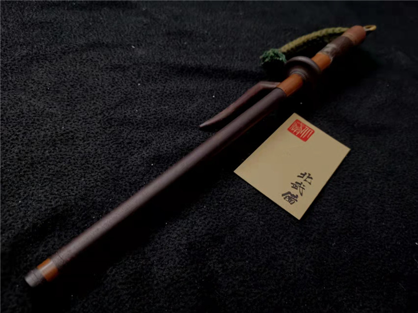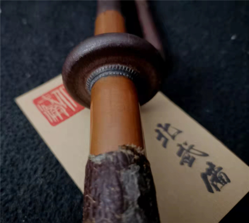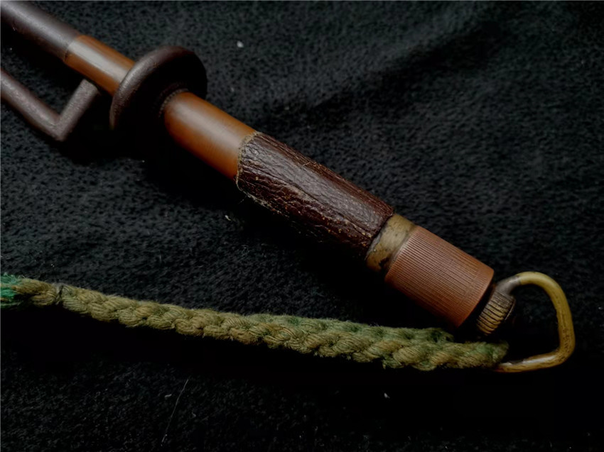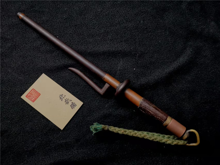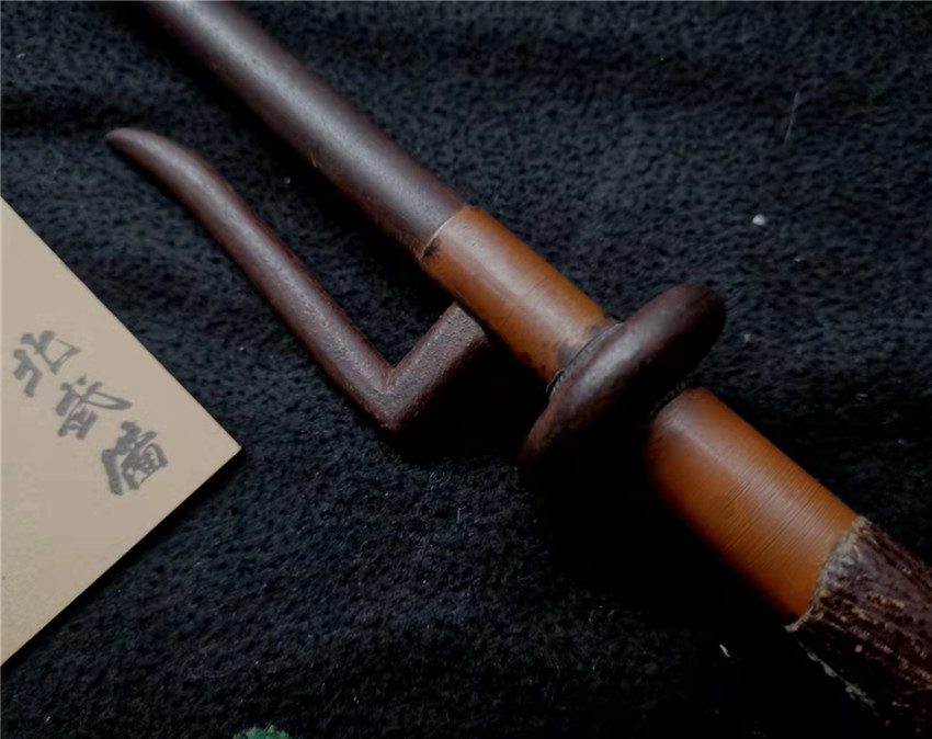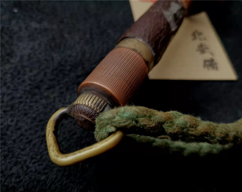 数据: 全长39厘米,十手前部长24.3厘米,柄长13.5厘米, 直径1.3厘米,小枝长8.3厘米。 十手,日本官方称呼为"十手"日文作"サイ",该型武器英文名由日文音译为"Sai",中文作"十手"。与中国铁尺有相似之处,又有区别。现在常用于空手道的器械教学,又称空手道短叉。至于忍者匕首称法是自忍者神龟这一动画产生后叫出的俗称。曾经有文献记载,十手是由日本江户时代时来自中国的陈元赟所传至日本的柔术武具之一(《近世事物考》);可是在室町时代中期十手术已经在日本广泛流传,而且在战国时代十手更是以威力能劈开头盔而著名的武器。所以陈元赟是十手创制人的说法,亦只是一种传言而已。 十手的设计就是用来克制刀剑用的。自近代起,十手将中刺(saki)两旁的横架(monouji)改成了向上的样子;持柄末端加上锤头(saikasika),用于加强直拳反击的破坏力。十手成为了现在我们看到的形态。该设计是针对太刀的,用于卡刀--断刀--攻喉,而且很明显,其防御力强于攻击力。在没有什么资源的硫球人手中,威力无穷的铁尺被改进成了"十手"这么一类由低碳钢,甚至仅仅只是生铁构成的低成本武器。 这支十手非常漂亮,经过几百年的使用盘玩表面已经有了非常漂亮的包浆,整体工艺铜铁结合,握把用到了红铜,黄铜和紫铜三种铜,十手挡手圆形设计,镡厚实两侧带有铜花片,就连小枝部位也做了精细的处理,可见匠人在制作这支十手的时候下了足够的细工,绝对是十手中的精品,是入藏的精品!!! | ||||||||||