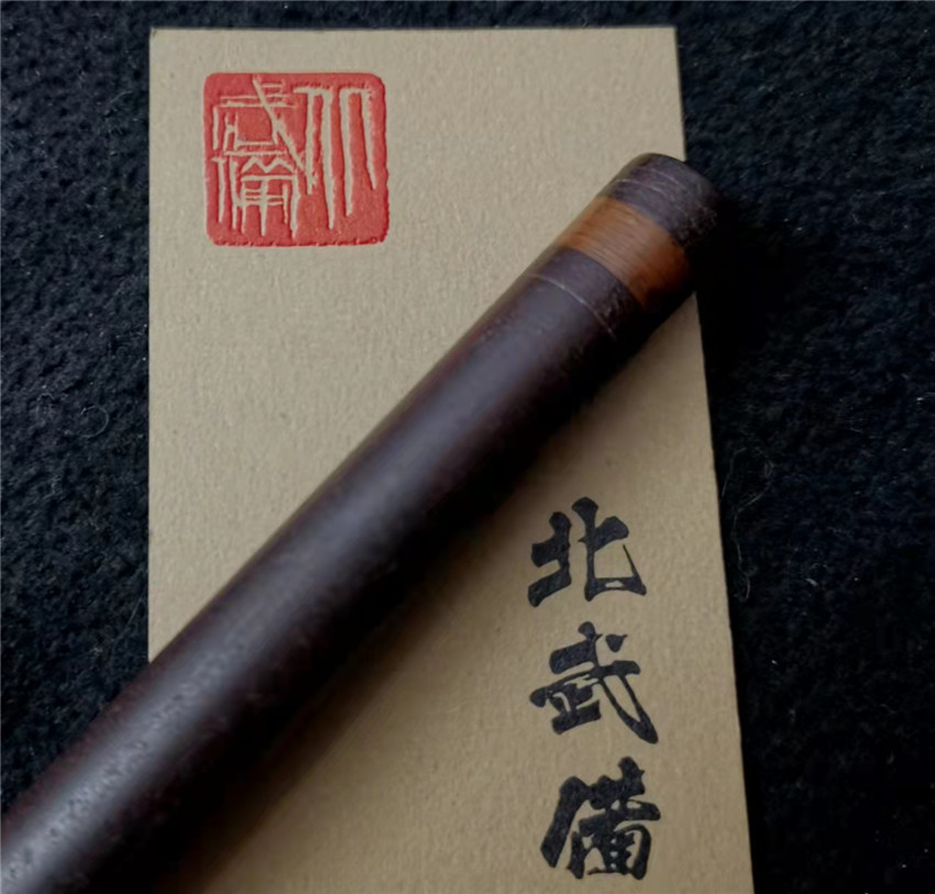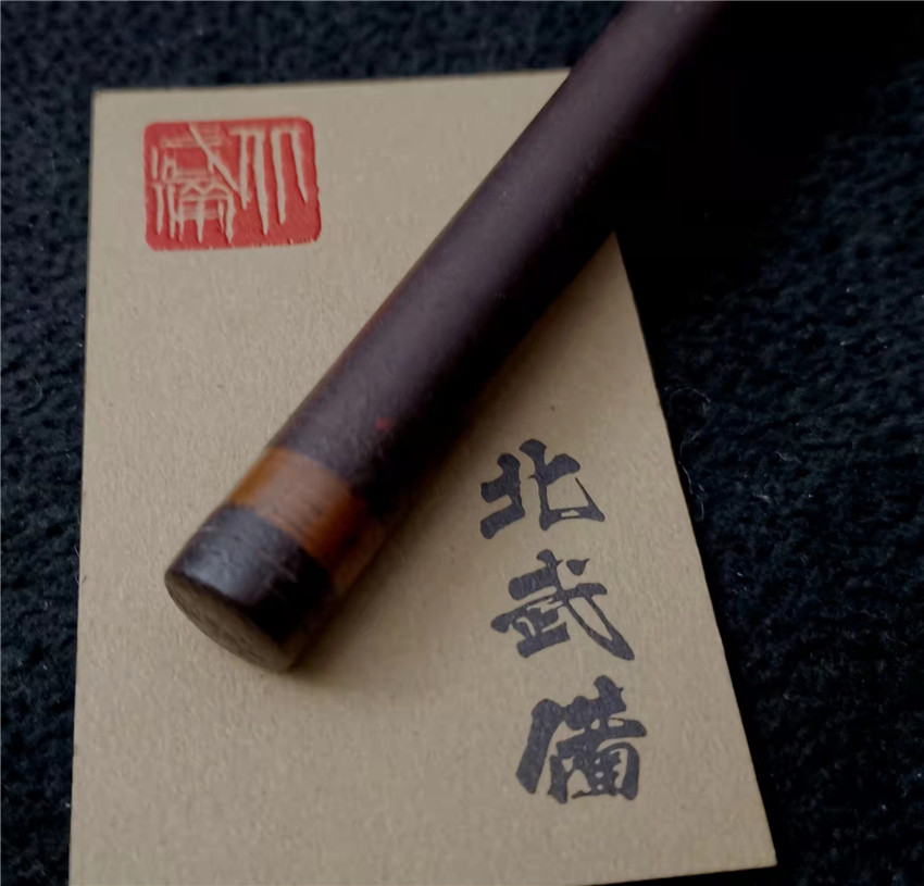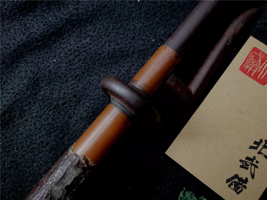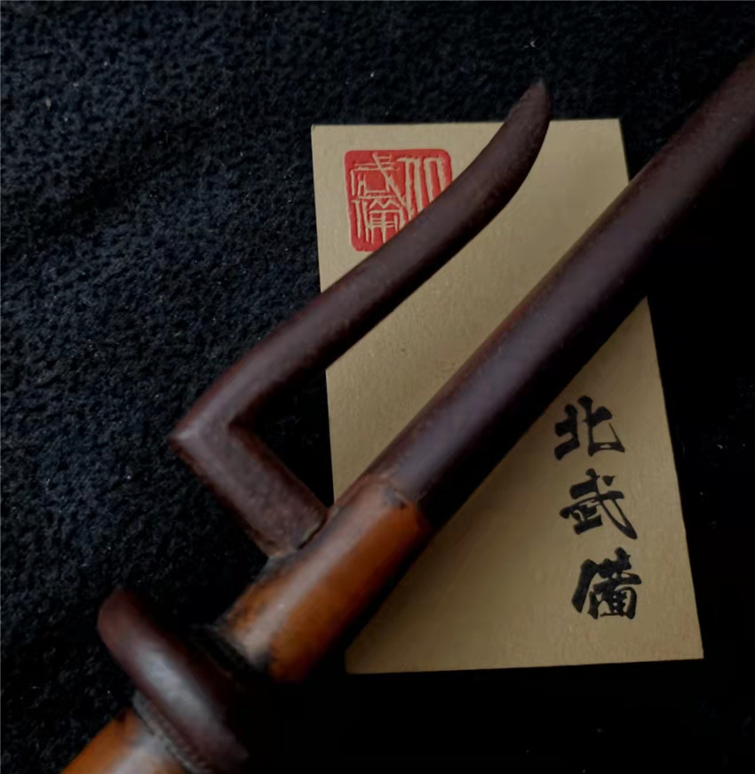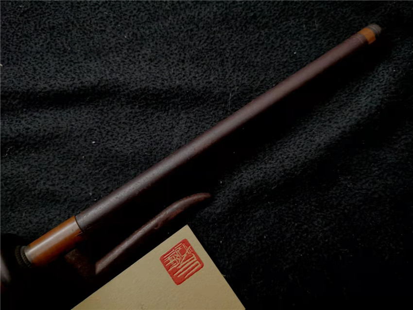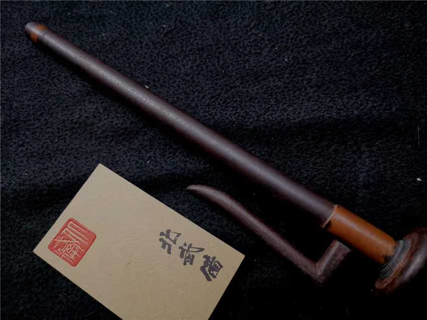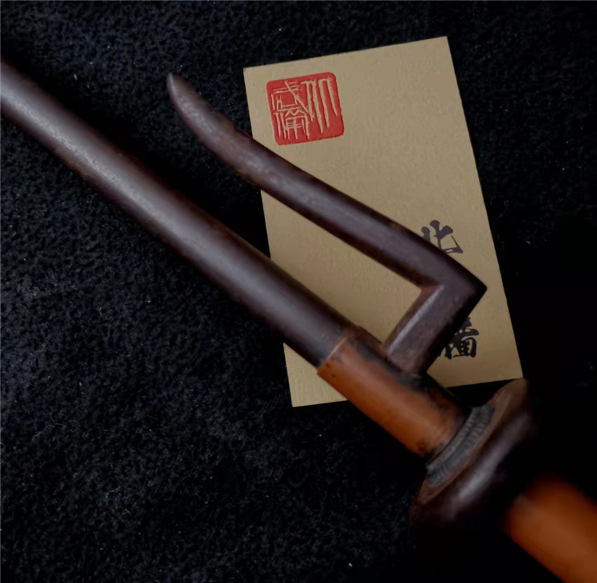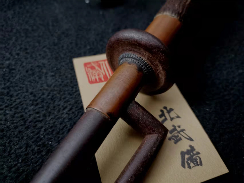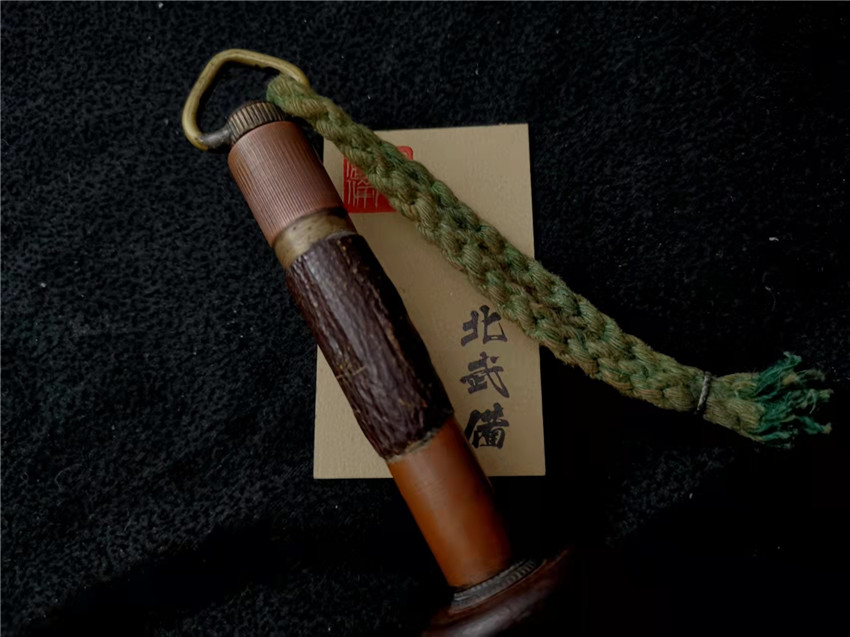 数据: 全长39厘米,十手前部长24.3厘米,柄长13.5厘米, 直径1.3厘米,小枝长8.3厘米。 十手,日本官方称呼为"十手"日文作"サイ",该型武器英文名由日文音译为"Sai",中文作"十手"。与中国铁尺有相似之处,又有区别。现在常用于空手道的器械教学,又称空手道短叉。至于忍者匕首称法是自忍者神龟这一动画产生后叫出的俗称。曾经有文献记载,十手是由日本江户时代时来自中国的陈元赟所传至日本的柔术武具之一(《近世事物考》);可是在室町时代中期十手术已经在日本广泛流传,而且在战国时代十手更是以威力能劈开头盔而著名的武器。所以陈元赟是十手创制人的说法,亦只是一种传言而已。 十手的设计就是用来克制刀剑用的。自近代起,十手将中刺(saki)两旁的横架(monouji)改成了向上的样子;持柄末端加上锤头(saikasika),用于加强直拳反击的破坏力。十手成为了现在我们看到的形态。该设计是针对太刀的,用于卡刀--断刀--攻喉,而且很明显,其防御力强于攻击力。在没有什么资源的硫球人手中,威力无穷的铁尺被改进成了"十手"这么一类由低碳钢,甚至仅仅只是生铁构成的低成本武器。 这支十手非常漂亮,经过几百年的使用盘玩表面已经有了非常漂亮的包浆,整体工艺铜铁结合,握把用到了红铜,黄铜和紫铜三种铜,十手挡手圆形设计,镡厚实两侧带有铜花片,就连小枝部位也做了精细的处理,可见匠人在制作这支十手的时候下了足够的细工,绝对是十手中的精品,是入藏的精品!!! | ||||||||||