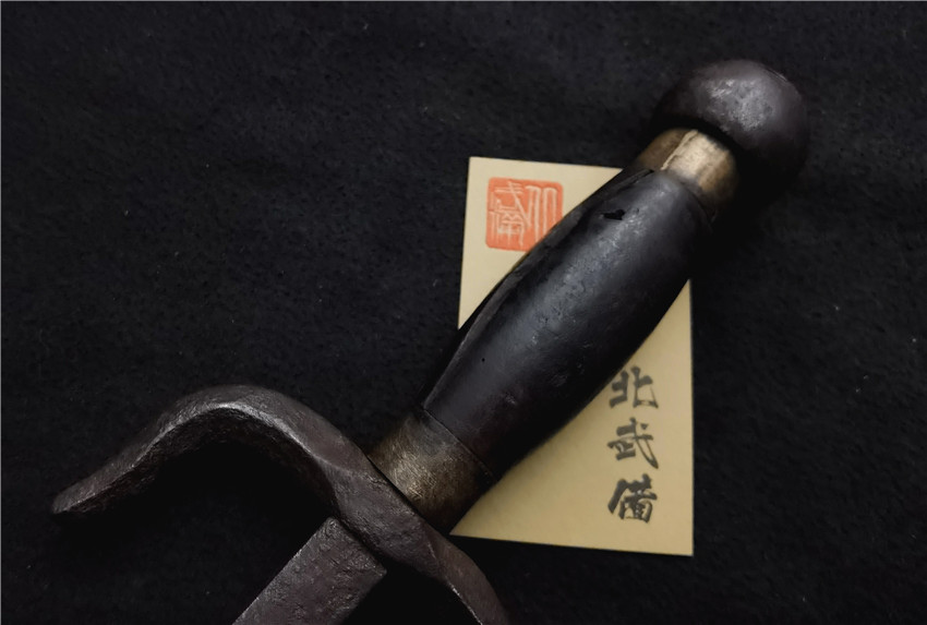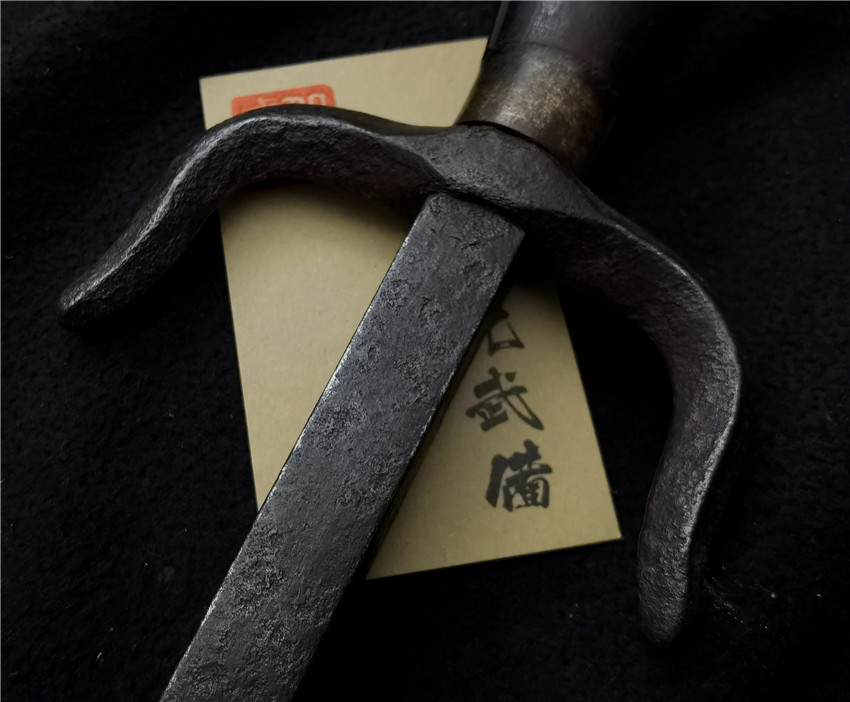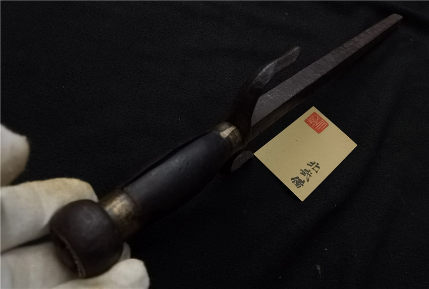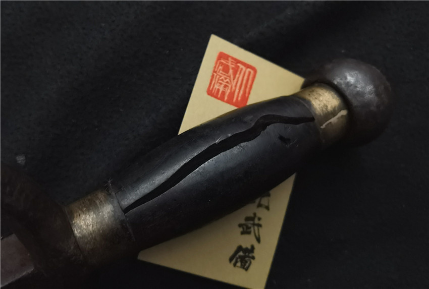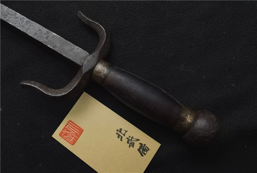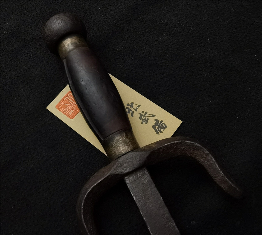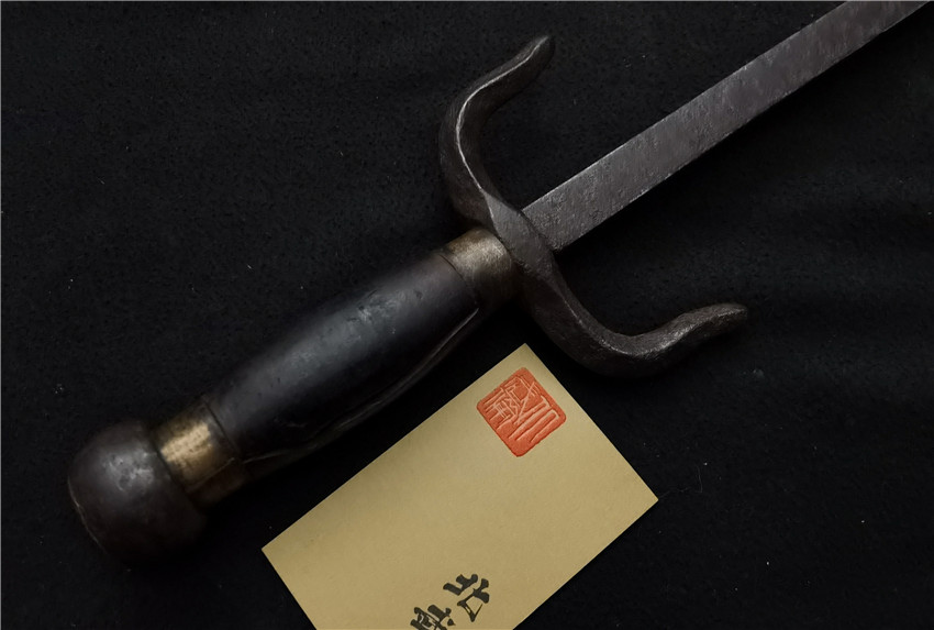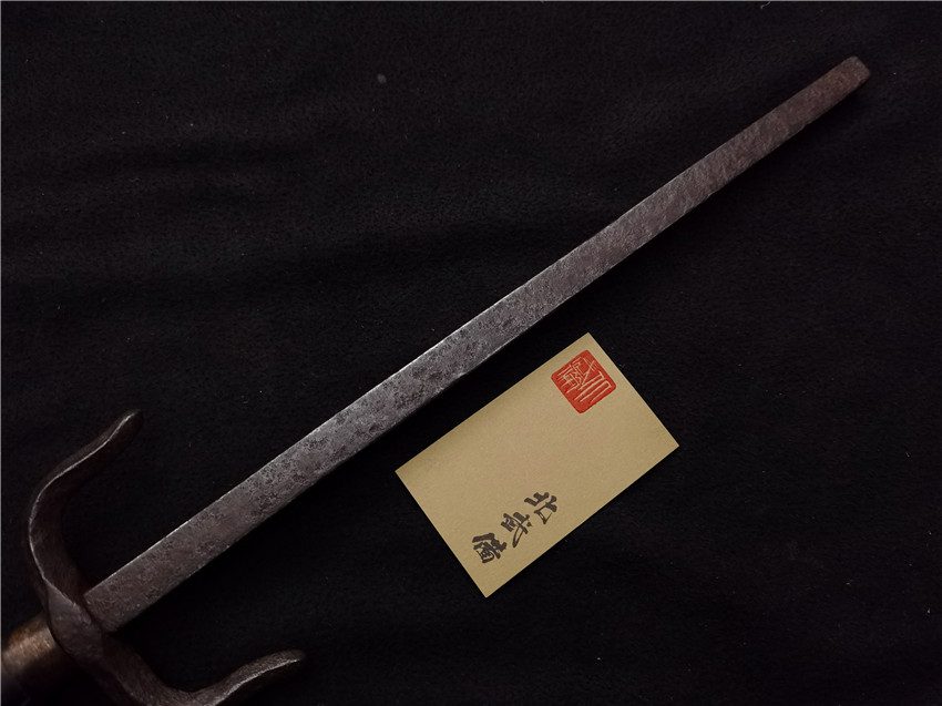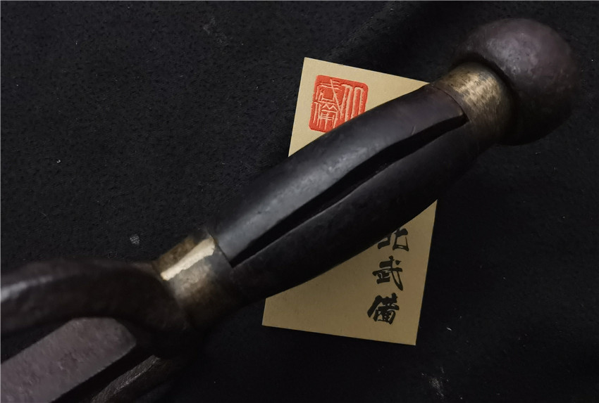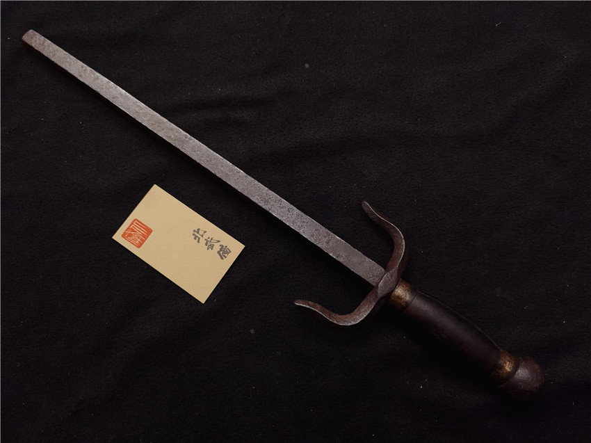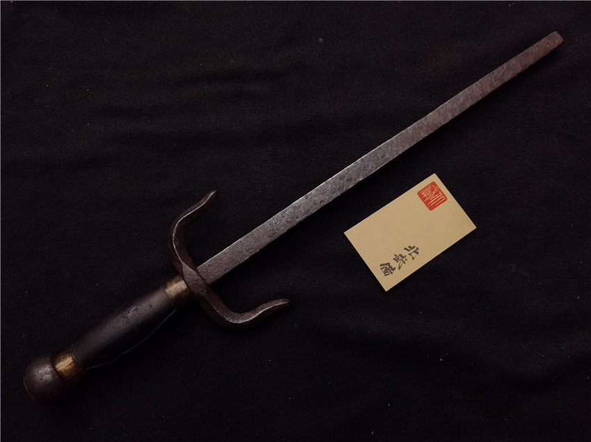 数据: 全长49.1厘米,锏身长36厘米,原型柄首直径3.5厘米,锏身直径1.6X1.6厘米。 这种手叉锏又名山字锏,属于中国古代钝兵器,多数为成对使用, 有专门使用的招数,手叉锏方便携带,是刀剑等刃器的克星,两广,福建,安徽地区比较多,做工良莠不齐,做工精美的非常漂亮,精美绝伦,常见者多为普通款式。 这支手叉锏和常见手叉锏不同,这支手叉锏整体用料厚实,属于典型的实战锏,很多这种手叉锏锏身为菱形,锏身制作的也比较小,这支手叉锏锏身四棱厚重,柄用紫檀制作,因为常年盘玩柄木油润暗黑色带有一点点紫 ,由于年代久远木柄内进了水,鐡的锏柄生锈木柄张烈,但是柄木没有缺,本身一直素鐡锏平淡无奇,但是画龙点睛的工艺体现来锏的山字挡手上,全鐡的挡手制作规整,线条分割犀利,呈多面体,在古代铜比较软容易加工,用鐡制作就比较费工,另外柄首尾铆的铜花铆片的搭配,给这支锏增添了一些素雅 !!!! | ||||||||||