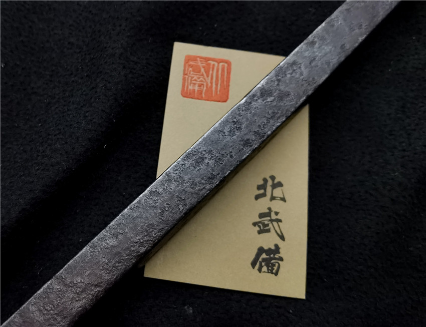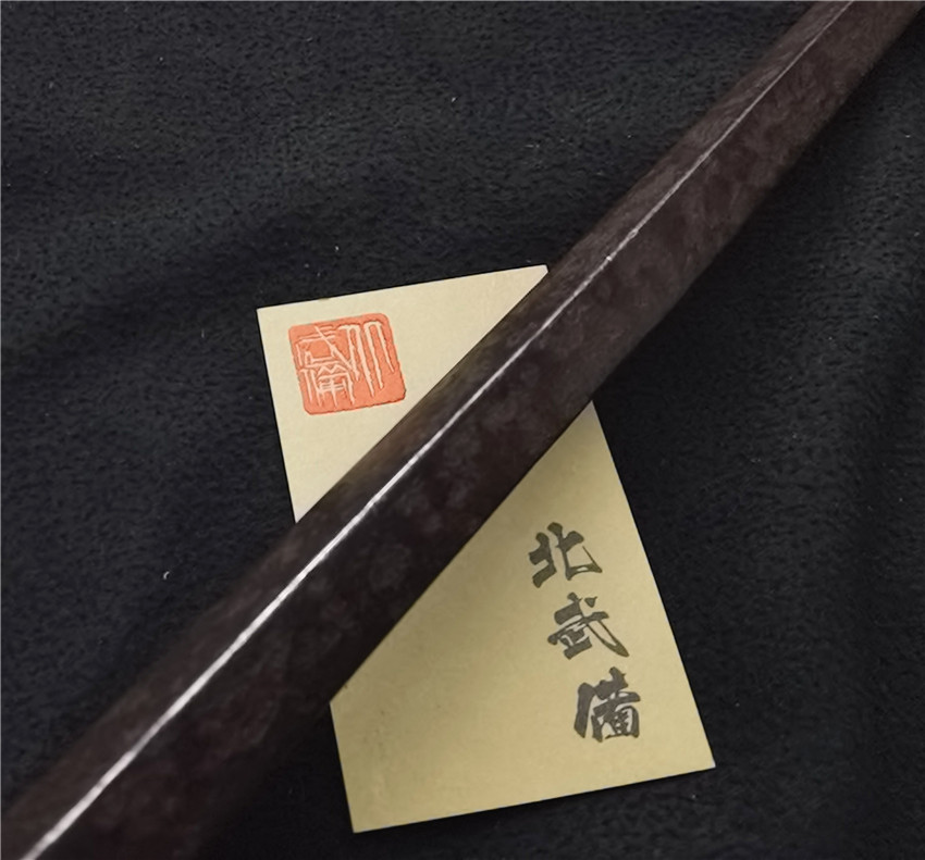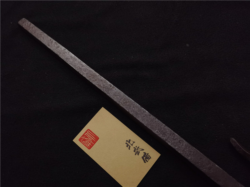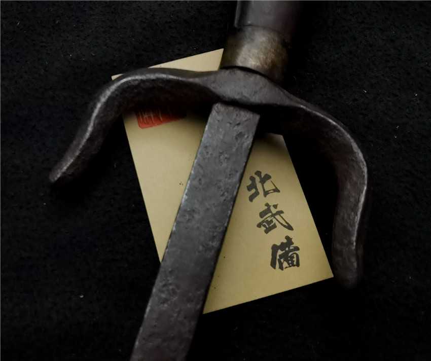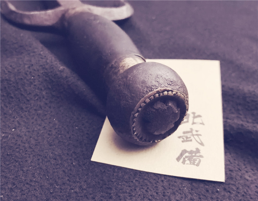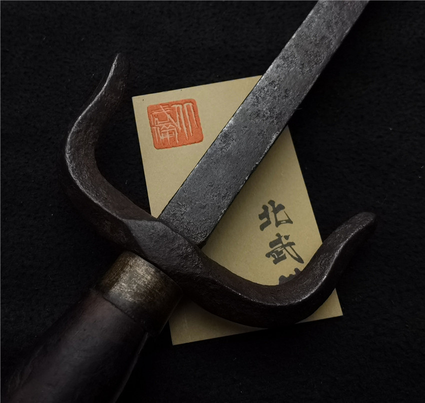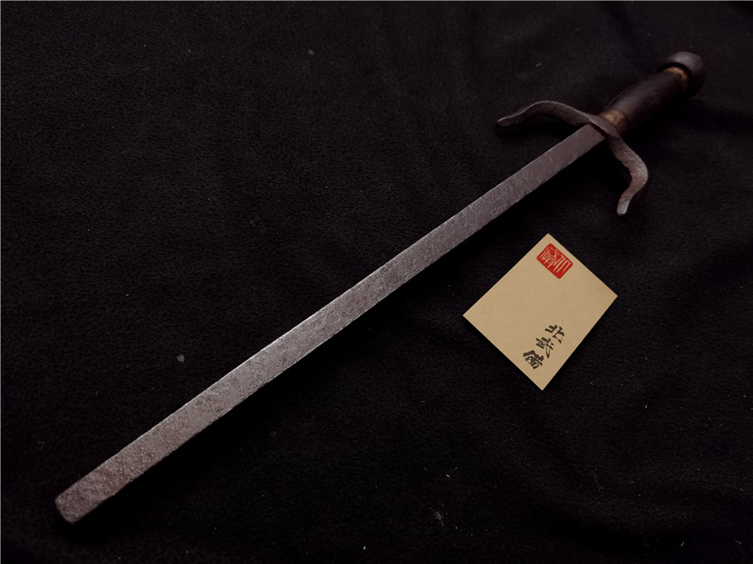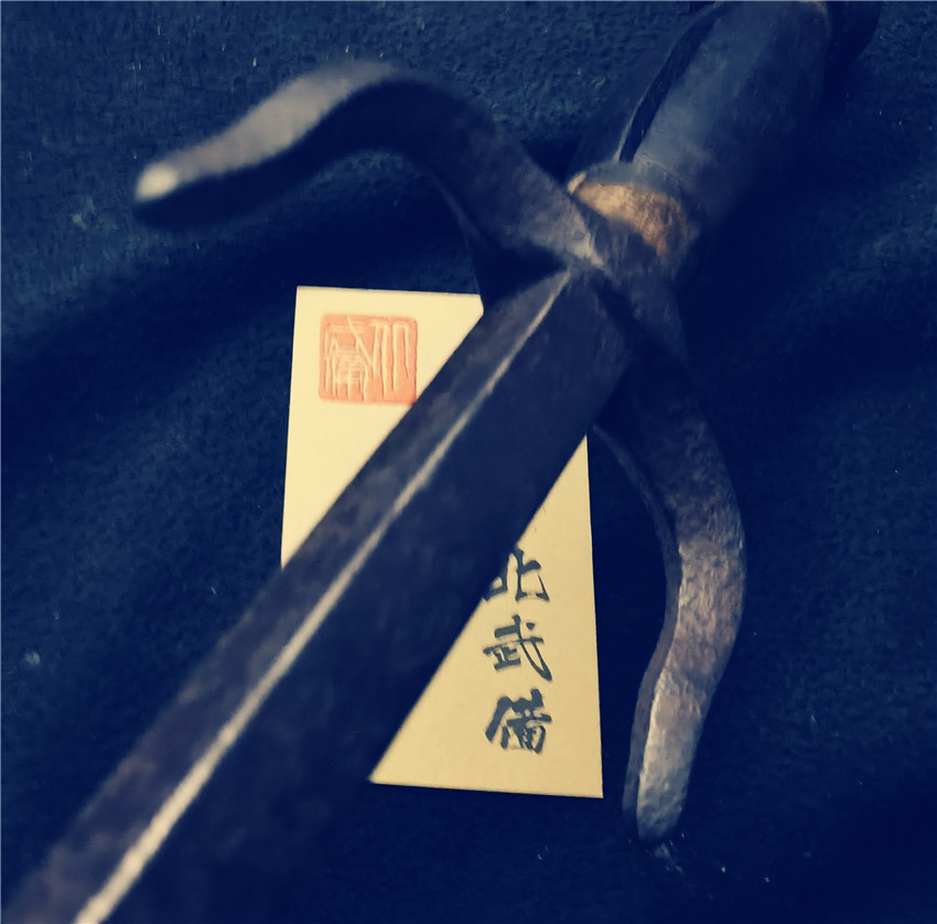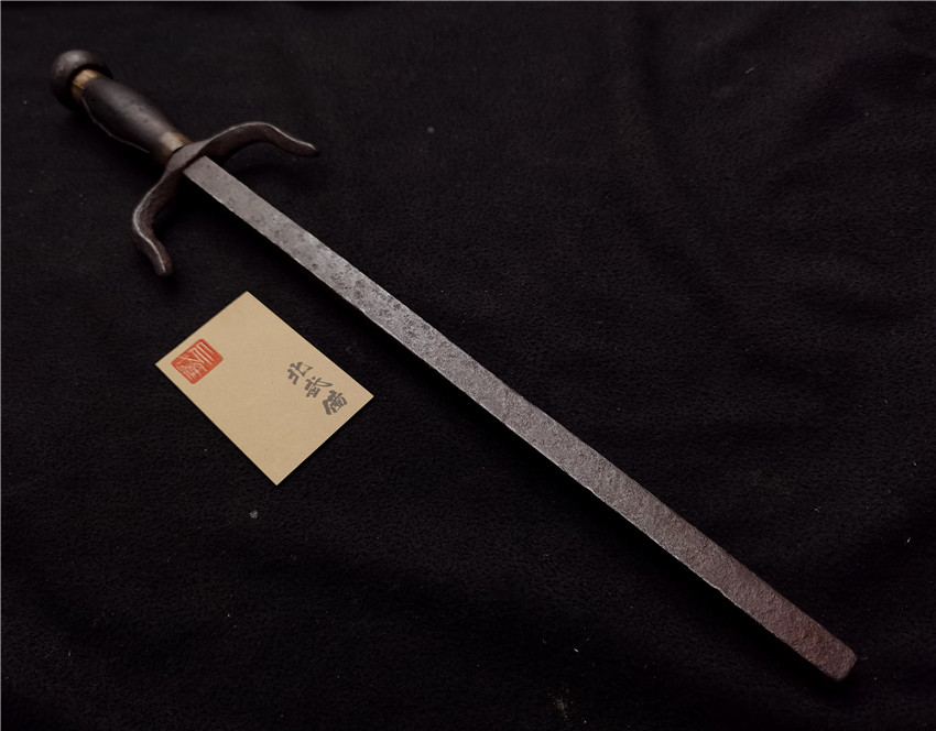 数据: 全长49.1厘米,锏身长36厘米,原型柄首直径3.5厘米,锏身直径1.6X1.6厘米。 这种手叉锏又名山字锏,属于中国古代钝兵器,多数为成对使用, 有专门使用的招数,手叉锏方便携带,是刀剑等刃器的克星,两广,福建,安徽地区比较多,做工良莠不齐,做工精美的非常漂亮,精美绝伦,常见者多为普通款式。 这支手叉锏和常见手叉锏不同,这支手叉锏整体用料厚实,属于典型的实战锏,很多这种手叉锏锏身为菱形,锏身制作的也比较小,这支手叉锏锏身四棱厚重,柄用紫檀制作,因为常年盘玩柄木油润暗黑色带有一点点紫 ,由于年代久远木柄内进了水,鐡的锏柄生锈木柄张烈,但是柄木没有缺,本身一直素鐡锏平淡无奇,但是画龙点睛的工艺体现来锏的山字挡手上,全鐡的挡手制作规整,线条分割犀利,呈多面体,在古代铜比较软容易加工,用鐡制作就比较费工,另外柄首尾铆的铜花铆片的搭配,给这支锏增添了一些素雅 !!!! | ||||||||||