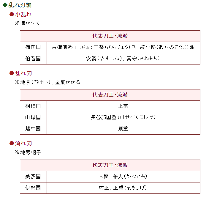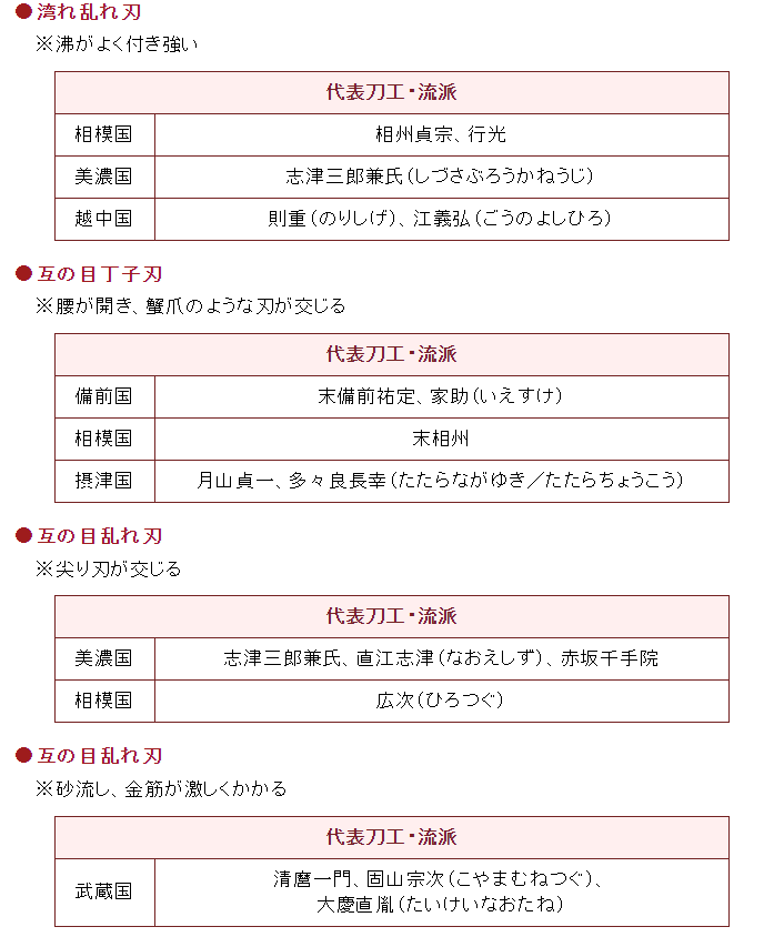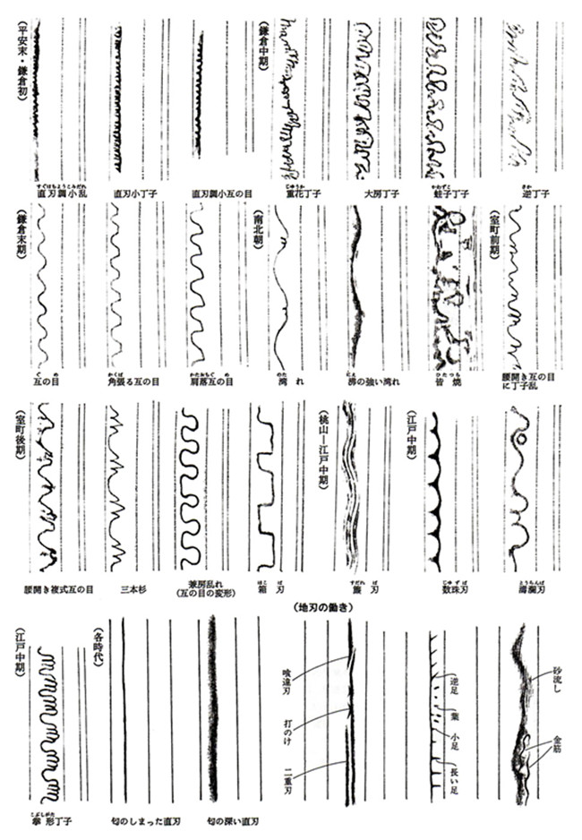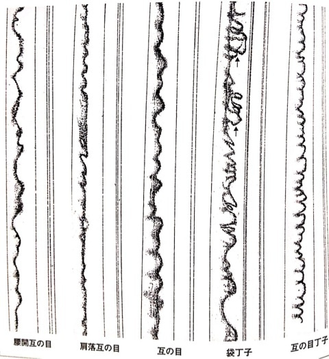◇(丸)互目 连续的凹凸半圆状呈波纹型的刃文,在此基础上可做线条样式的变化。 ◇肩(片)落互目/锯刃 刃线最高处靠近镐地的部分叫做“头”,将丸互目的头抹平些的互目刃叫做肩落互目刃,通常肩落互目也伴随着逆足现象。 ◇三本杉 像杉树并列在一起的树林外观的尖头互目刃文。多为三个三角形为一组,其中间的三角形要高些。 ◇湾刃 像波浪一样的刃文 ◇数珠丸 丸互目刃的一种,像念佛的数珠外观一样。 ◇簾刃 在刃区里与刃文平行的沸线或地上带有装饰性的飞烧,像竹制门帘的样式。 ◇涛乱 像汹涌澎湃的波涛的大互目 ◇皆烧 整只刀都有着斑驳的烧刃痕迹 ◇箱乱 丸互目的半圆形扩张成方块形,像箱子一样的形状。