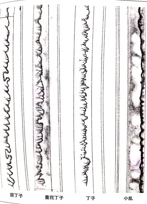 (刃文样式汇总) 与直线状烧刃对应的便是叫做乱刃的刃文了。比如镰仓时期中叶出现的重花丁子乱、战国时期美浓关派出来的箱乱 三本杉、江户时期的涛乱大互目、以及以湾刃为基调的相州传在全盛时期发展出的种种乱刃,林林总总加起来有二十八种之多。我们来了解一下鉴赏中会遇到的常见乱刃。 ◇丁子 像丁子的果实一样相连的形状 ◇重花丁子 丁子与丁子间的大小间隔犹如八重樱一样重合交错 ◇逆丁子 丁子的足偏向切先方向的丁子刃 ◇足长丁子 通常是丁子头华丽连贯的样式,丁子足的长度十分明显