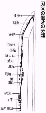 ◇足 相切于刃线的动态,是最常见的一种形式,根据形状和大小衍生了更详细的描述。 ◇小足 长度短小的足。 ◇鼠足 足中特短的现象。 ◇逆足 足的方向偏向于切先的方向。 ◇丁子足 丁子刃带来的此类动态样式汇总。根据丁子的结构特点,足的样式、大小也各有不同。 ◇叶 像摇曳的落叶散落在刃中的动态,是断开的足的独立形成部分。 ◇飞烧 游离出主刃文的地中部分烧刃。 ◇玉 圆圈状的飞烧,多为涛乱刃的装饰性刃文组成。 ◇砂流 刃中的沸点像是被笤帚烧过一样,呈平行于主刃文的动态。 ◇扫挂 帽子部分的砂流现象。 ◇金筋/稻妻 刃中的地景经高温的烧制呈现金色的光芒,如果金筋的形态是“Z”形的,就叫做稻妻(闪电)。 ◇汤走 因烧入时水泡的沸腾,在刃口之上留下的斑驳现象,汤走部分因为和刃口有着相近的冷却速率,从而带来了更晶莹的地沸。 ◇ほつれ 直刃中沿着锻肌的方向出现的的细线状动态。 ◇打除 把刃文比作水面的话,打除像是拍打水面而溅起的新月形样式的动态。多见于二重刃 三重刃样式的刃文。 ◇喰违 直刃中出现了“Z”字形的断层,并相互咬住的动态。如同拼接起来的形状。