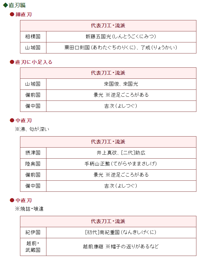 本讲说说鉴赏时遇到的常见刃文样式及相应制作群体。 1.刃文的常见样式 刃文的基本形状分为直刃和乱刃两大类,直线状的刃文总称为直刃。 直刃根据幅度的宽窄分为细直刃、中直刃和广直刃三个类别。直刃是各个时代都有制作的刃文样式,中直刃在镰仓时期中叶的作品上应用居多,细直刃多用于镰仓时代后期的高品味审美刀剑上,广直刃在战乱时期及新刀期的刀剑上应用较多。 乱刃的种类及代表刀工与流派