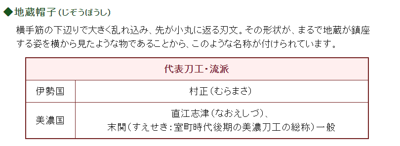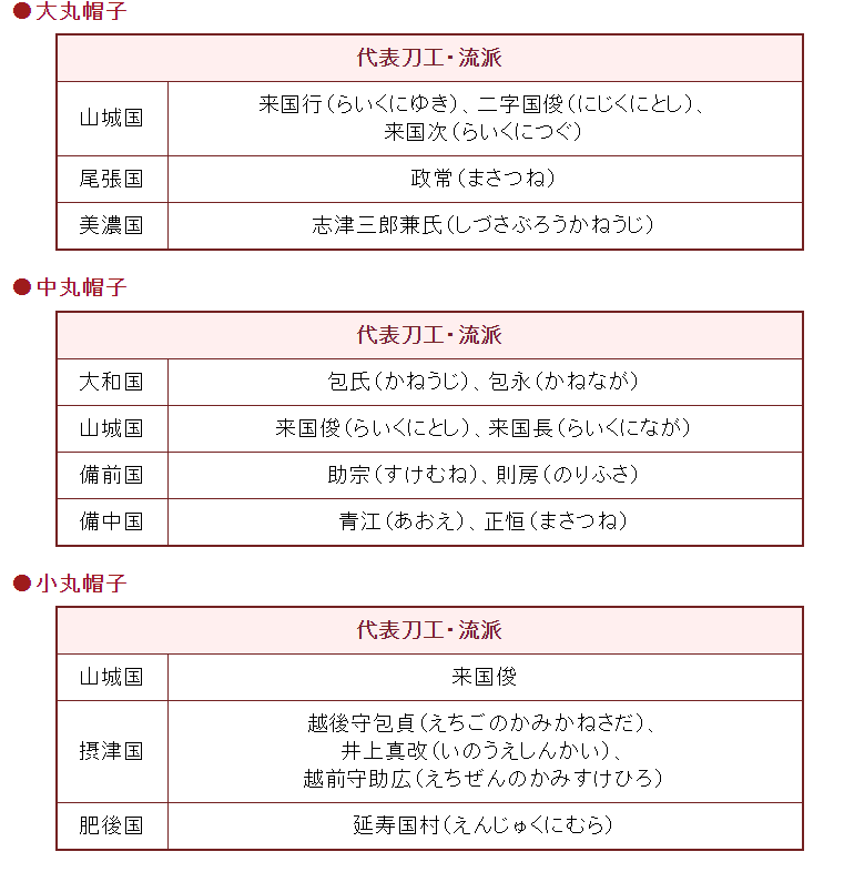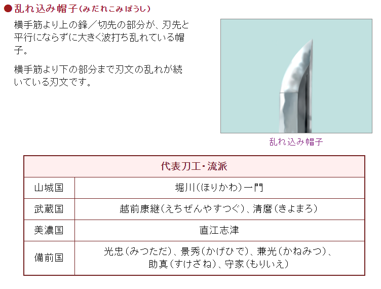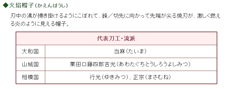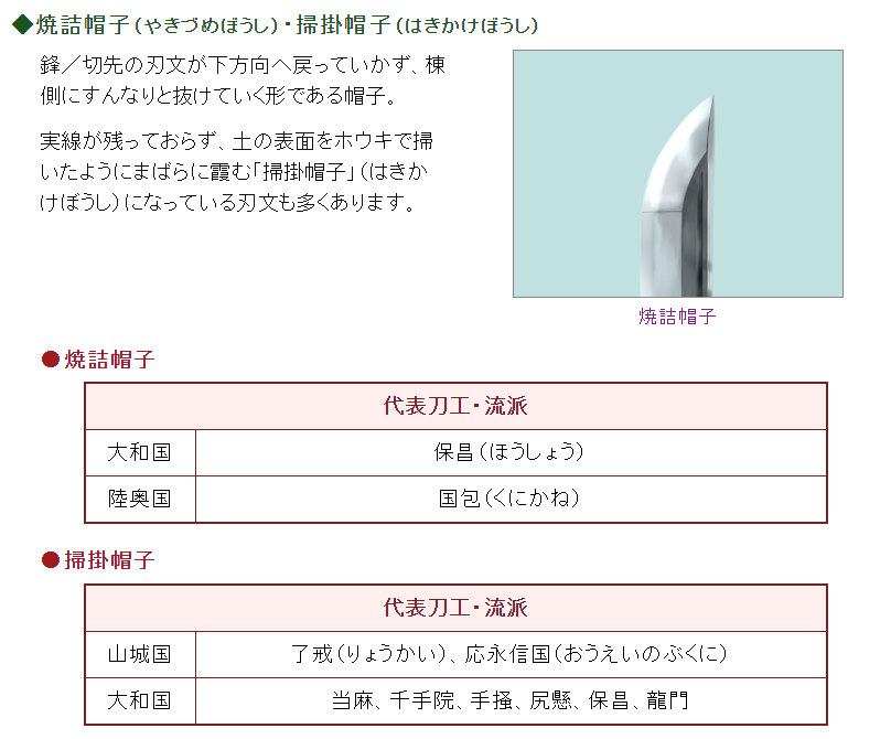 5.帽子的常见样式及归纳 切先与烧刃是日本刀剑的灵魂所在,而帽子作为切先上的烧刃更是重点所在。在鉴赏中我们看看看常见的帽子样式及制作流派。 (帽子的大致样式) ◇丸帽子 帽子的烧幅通常是平行于刃幅的,在临近刀尖处通常会向刀栋的方向折返。根据这个返的样式特点我们能叫出帽子的具体名称。比如圆形的折返我们叫做丸帽子,根据折返的弧度大小,便分出了大丸帽子、(中)丸帽子和小丸帽子。 ◇火焰帽子 扫挂朝着刀尖方向流动,像跃动的火焰。 ◇一枚帽子 几乎整个切先都是烧刃的情况。 ◇地藏帽子 帽子的返呈半圆状,犹如地藏菩萨的头型。 ◇烧诘帽子.扫挂帽子 没有“返”的帽子和犹如笤帚扫出的砂流样帽子。 ◇乱込帽子与返深帽子 与丸帽子相对,帽子的线条也是呈乱刃的设计样式,如果帽子朝栋方的返程距离长,便叫做返深。 6.刃文/帽子与流派常见搭配小结