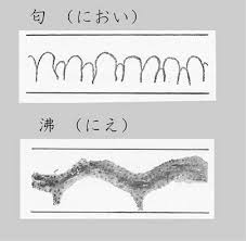 ◇匂深 匂的幅度广,颜色浓白深沉,多见于末备前物。 ◇匂缔 匂的幅度窄,颜色多明亮,多见于兼元。 ◇匂口缔 匂口的线条质感纤细,反射的明亮的光,多见于一文字、长船类。 ◇匂口冴 匂口散发着清冷的光芒,多见于新刀上作。 ◇匂口润(眠) 匂口与地铁混合的绵柔没有强烈的对比度,多见于幕末新新刀期羽山円真。 ◇匂口沉 匂口带有沉淀状层次感,多见于长船清光 关兼常类。 4.刃中动态小结 在鉴赏沸出与匂出的刃文中,会看到游离在刃中或地中的各种细节,我们把这些细节的样式特点做个小结。